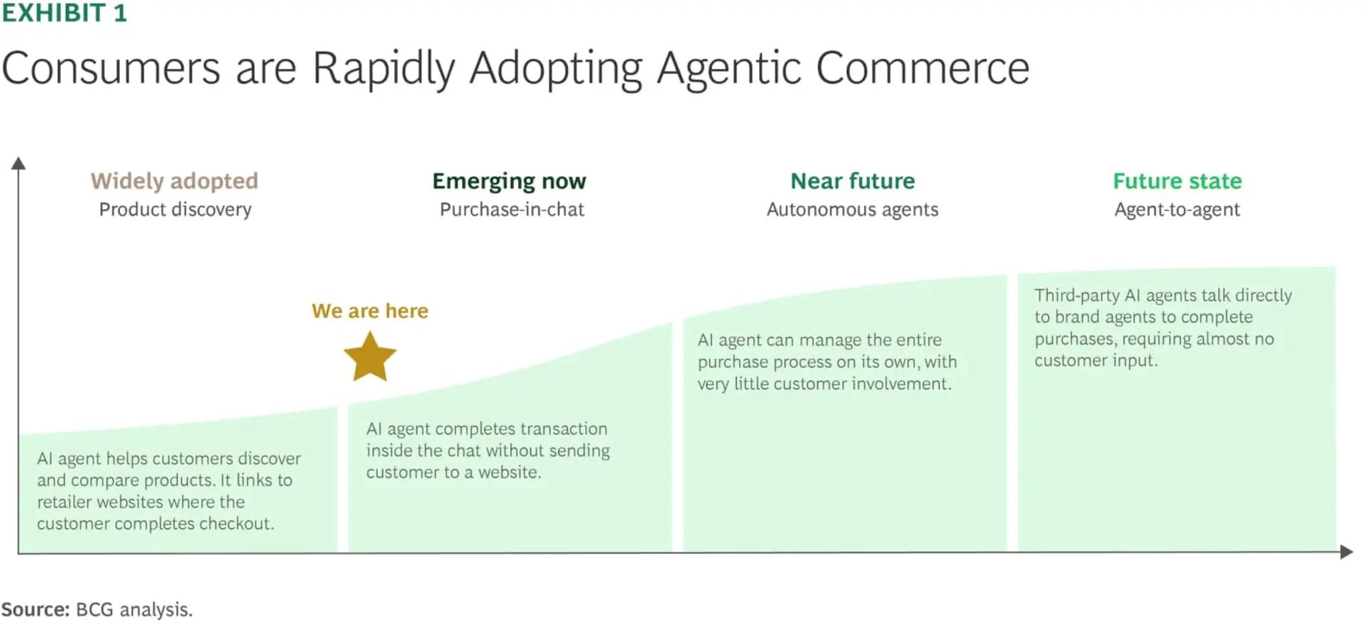 O objetivo final — o lado direito do gráfico — é o Agentic Commerce, onde agentes de IA conversam diretamente com agentes das marcas para negociar e comprar por você, quase sem sua intervenção. Provavelmente, na Black Friday do ano que vem, estaremos mais próximos dessa realidade autônoma.